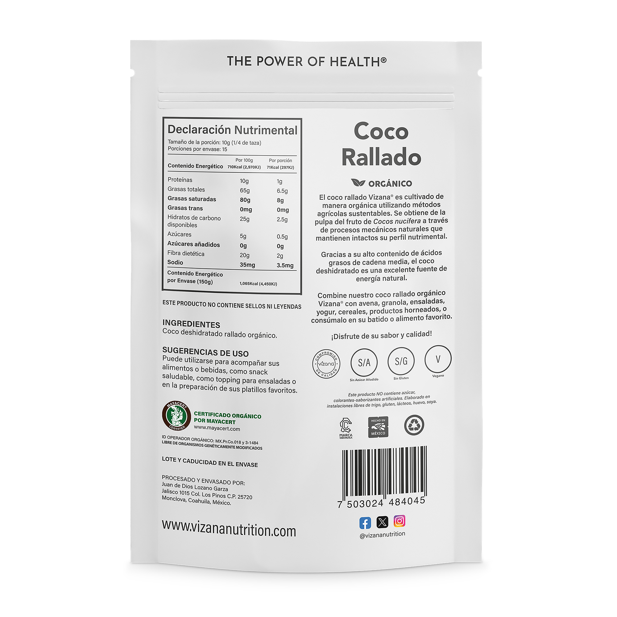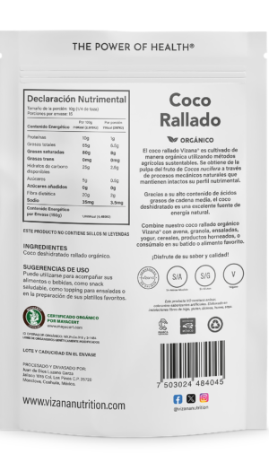 El coco rallado Vizana® es cultivado de manera orgánica utilizando métodos agrícolas sustentables. Se obtiene de la pulpa del fruto de Cocos nucifera a través de procesos mecánicos naturales que mantienen intactos su perfil nutrimental.