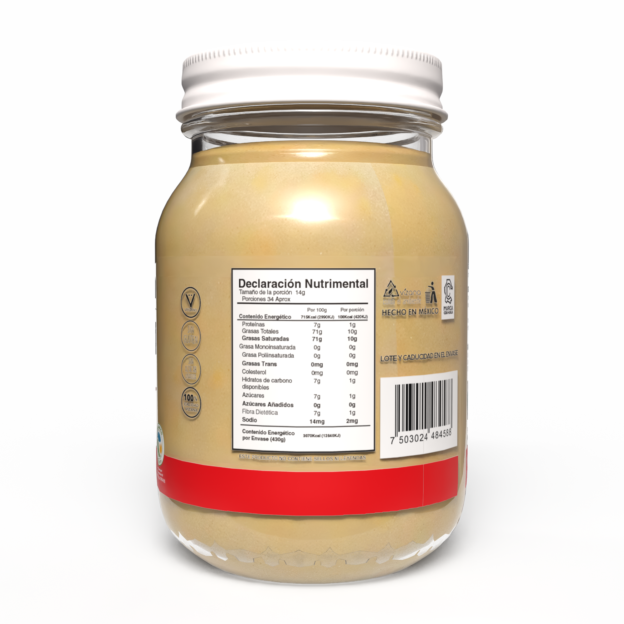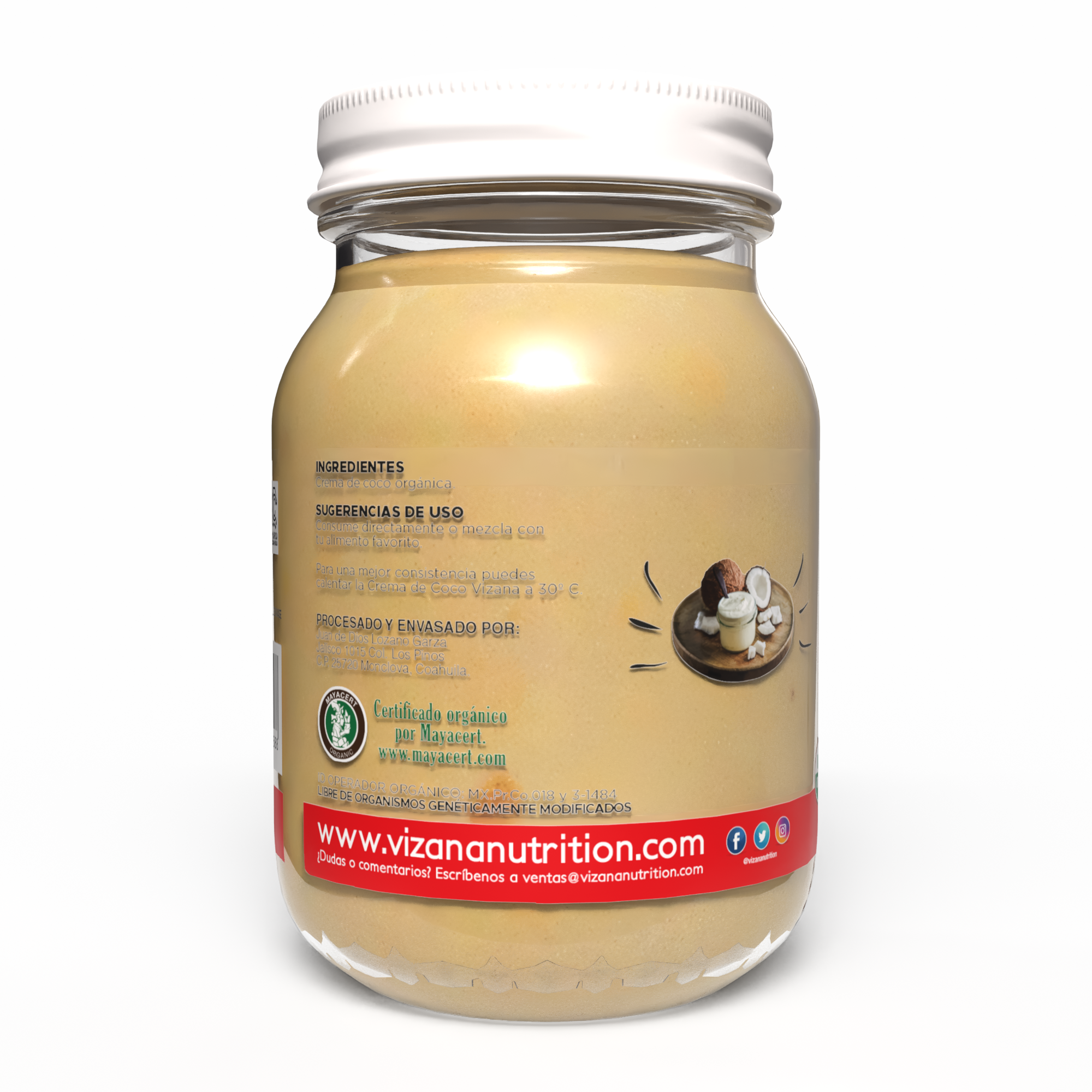 La crema de coco se obtiene de la pulpa del coco (Cocos nucifera) a través de medios mecánicos en frio que preservan sus nutrientes naturales. Por su contenido de ácidos grasos de cadena media es fuente de energía. Además contiene Complejo B, minerales como Sodio y Potasio.