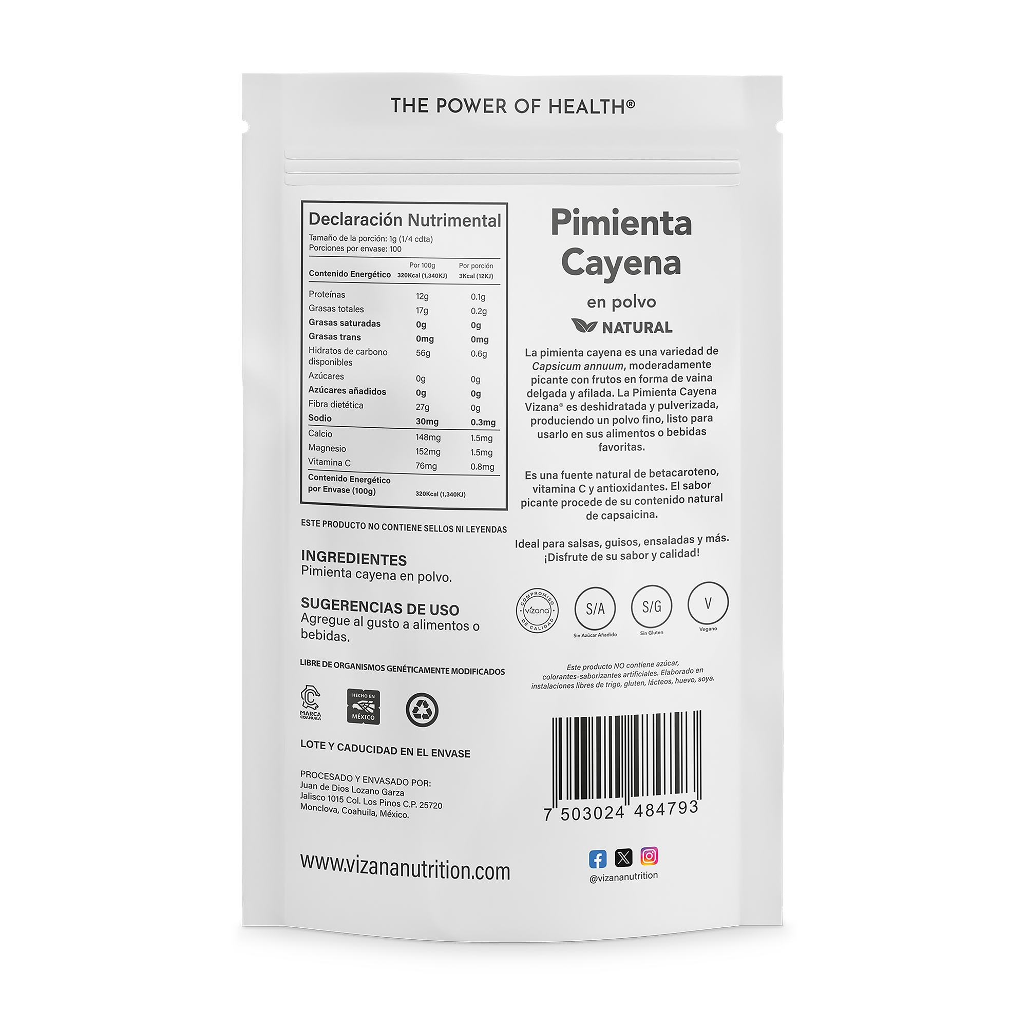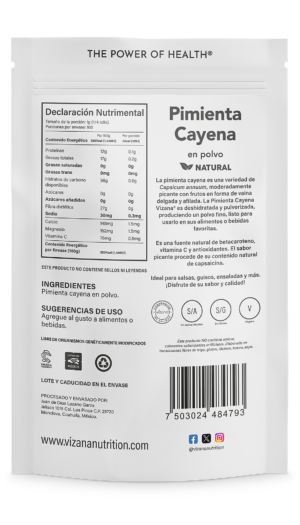La pimienta cayena es una variedad de Capsicum annuum, moderadamente picante con frutos en forma de vaina delgada y afilada. La Pimienta Cayena Vizana® es deshidratada y pulverizada, produciendo un polvo fino, listo para usarlo en sus alimentos o bebidas favoritas.