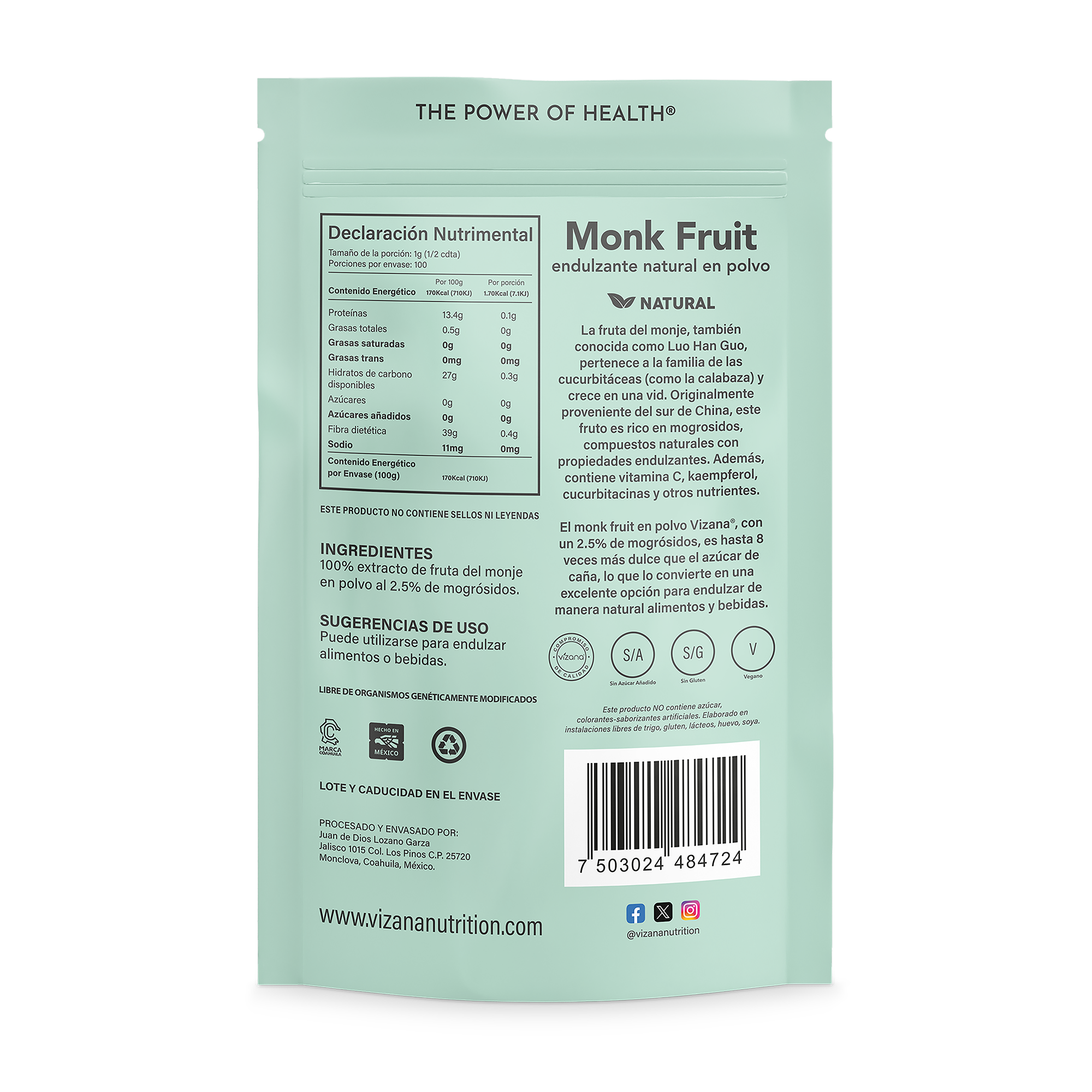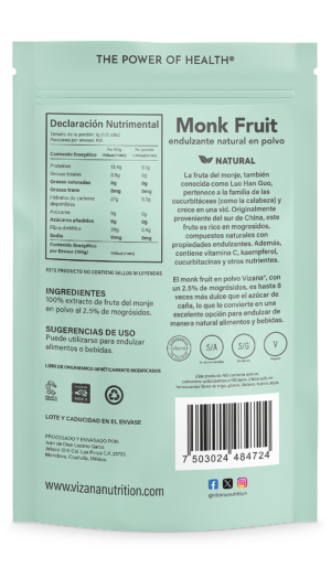 El monk fruit en polvo Vizana®, con un 2.5% de mogrósidos, es hasta 8 veces más dulce que el azúcar de caña, lo que lo convierte en una excelente opción para endulzar de manera natural alimentos y bebidas.