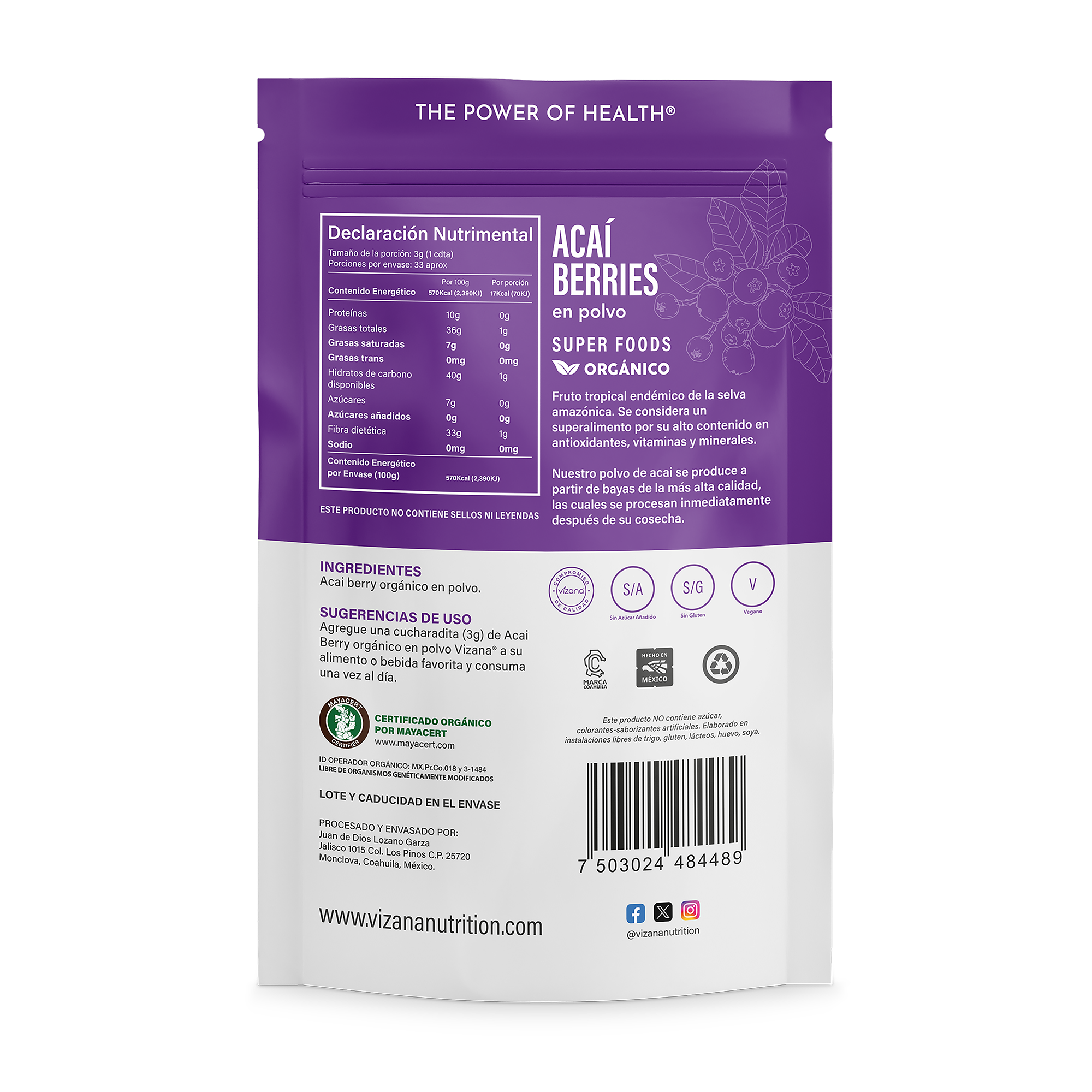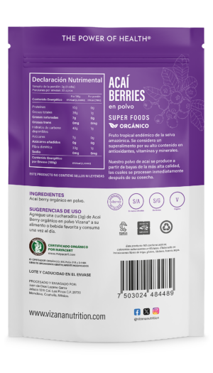 Agregue una cucharadita (3 g) de Acaí Berry orgánico en polvo Vizana® a su alimento o bebida favorita y consuma una vez al día.
