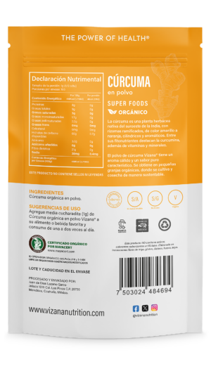 Agregue media cucharadita (1 g) de Cúrcuma orgánica en polvo Vizana® a su alimento o bebida favorita y consuma de una a dos veces al día.