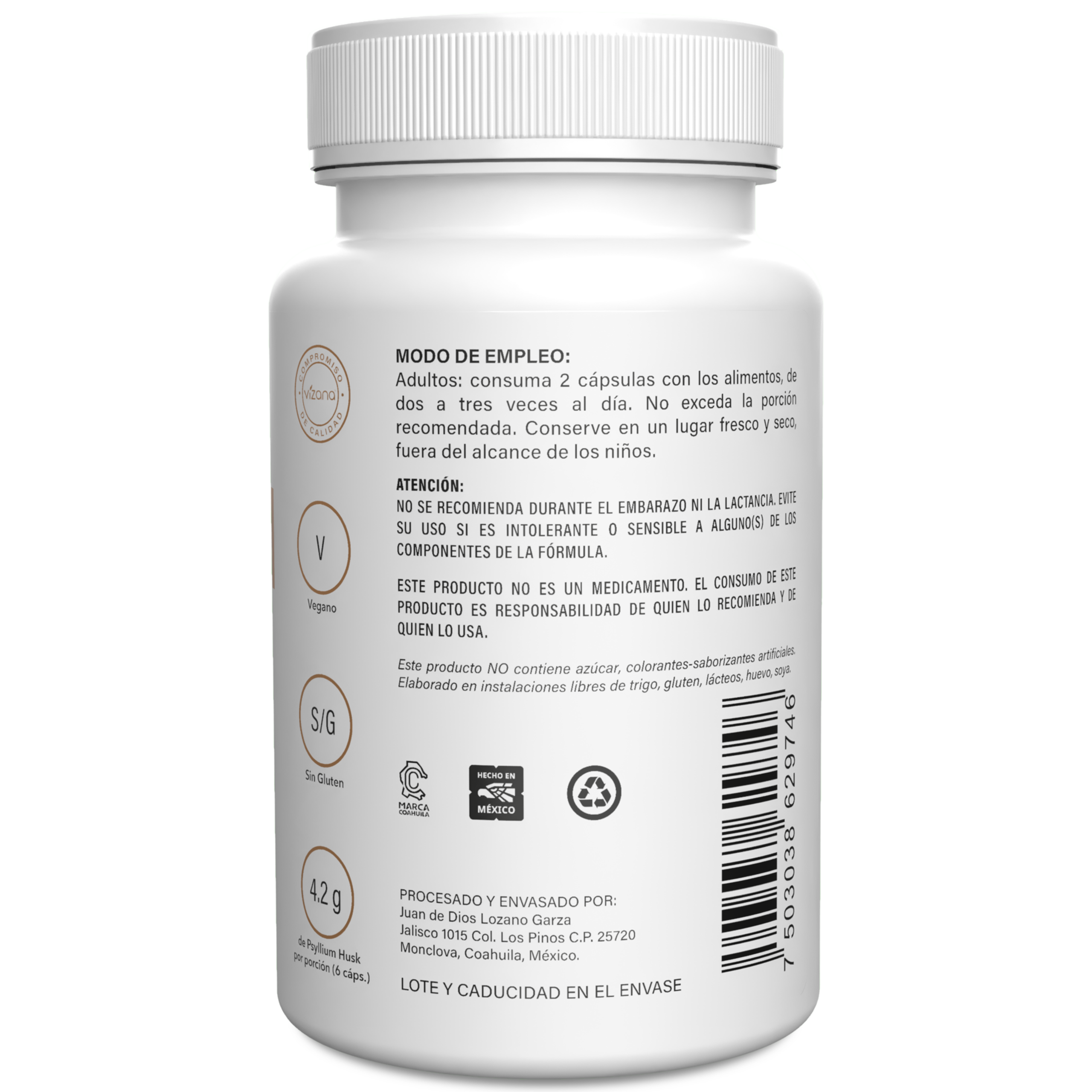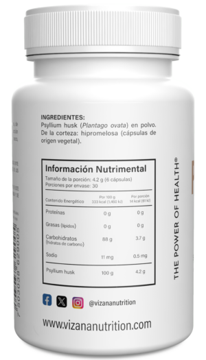 Psyllium husk (Plantago ovata) en polvo. De la corteza: hipromelosa (cápsulas de origen vegetal).