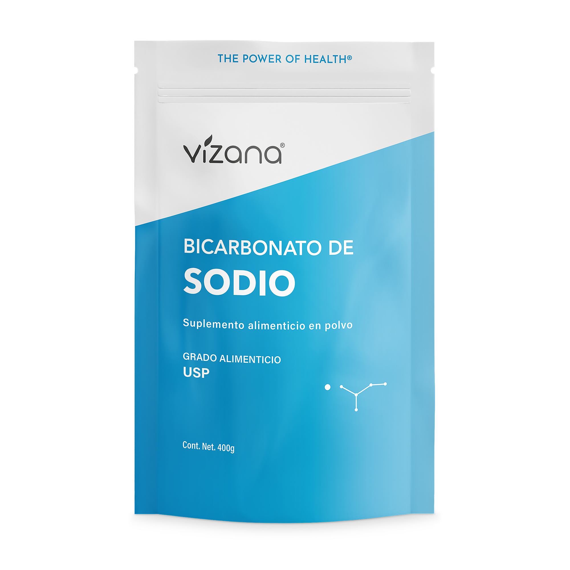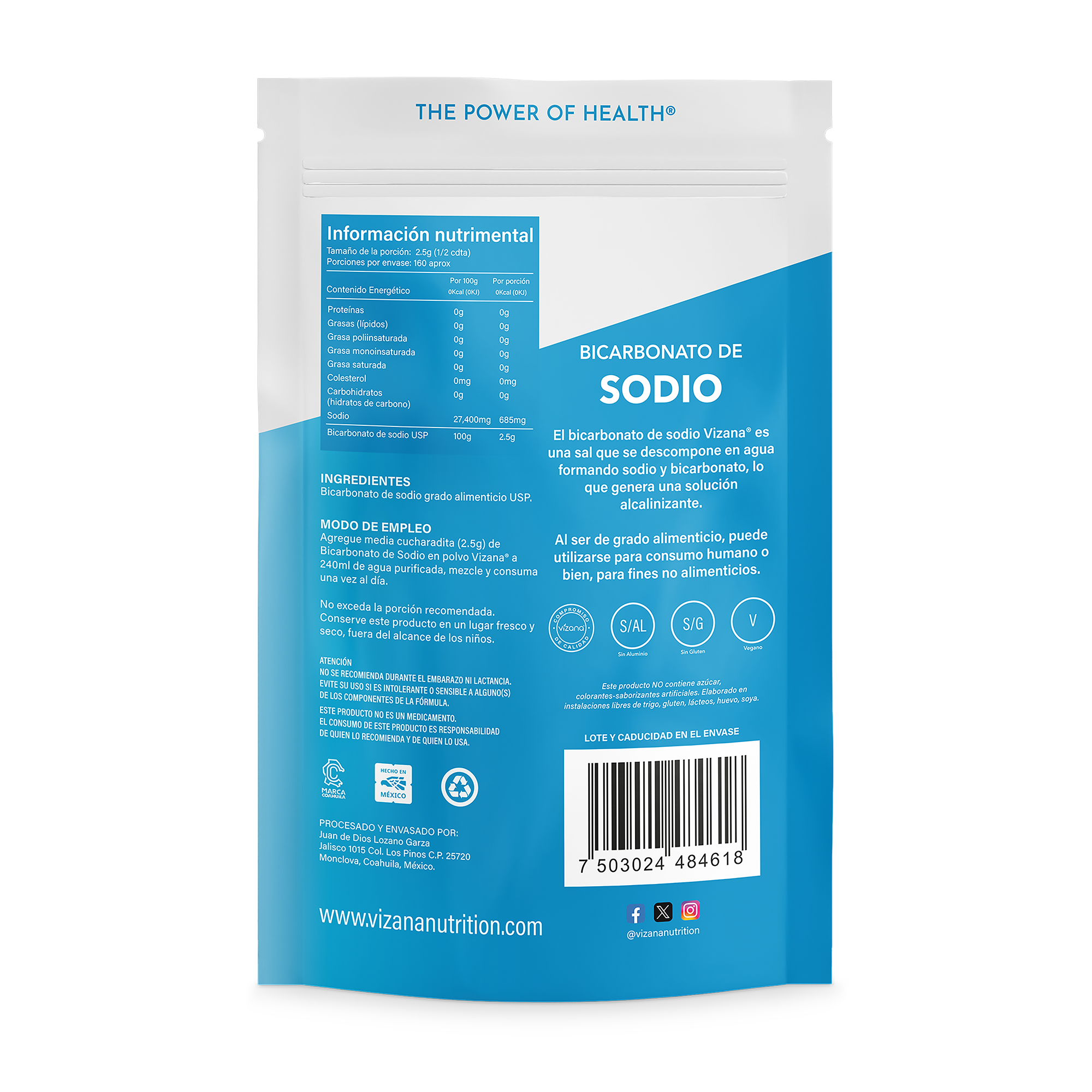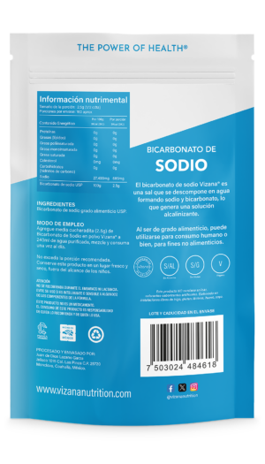 Agregue media cucharadita (2.5 g) de Bicarbonato de Sodio en polvo Vizana® a 240 ml de agua purificada, mezcle y consuma una vez al día. No exceda la porción recomendada.