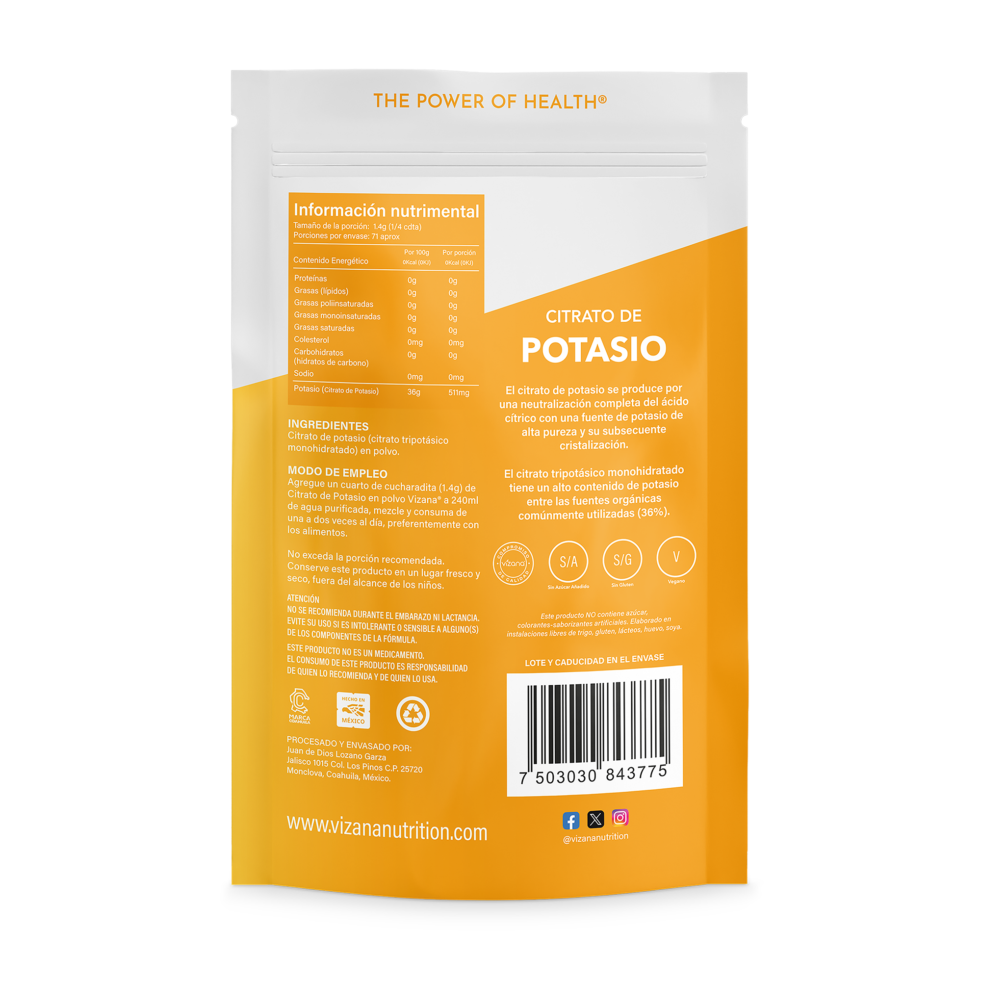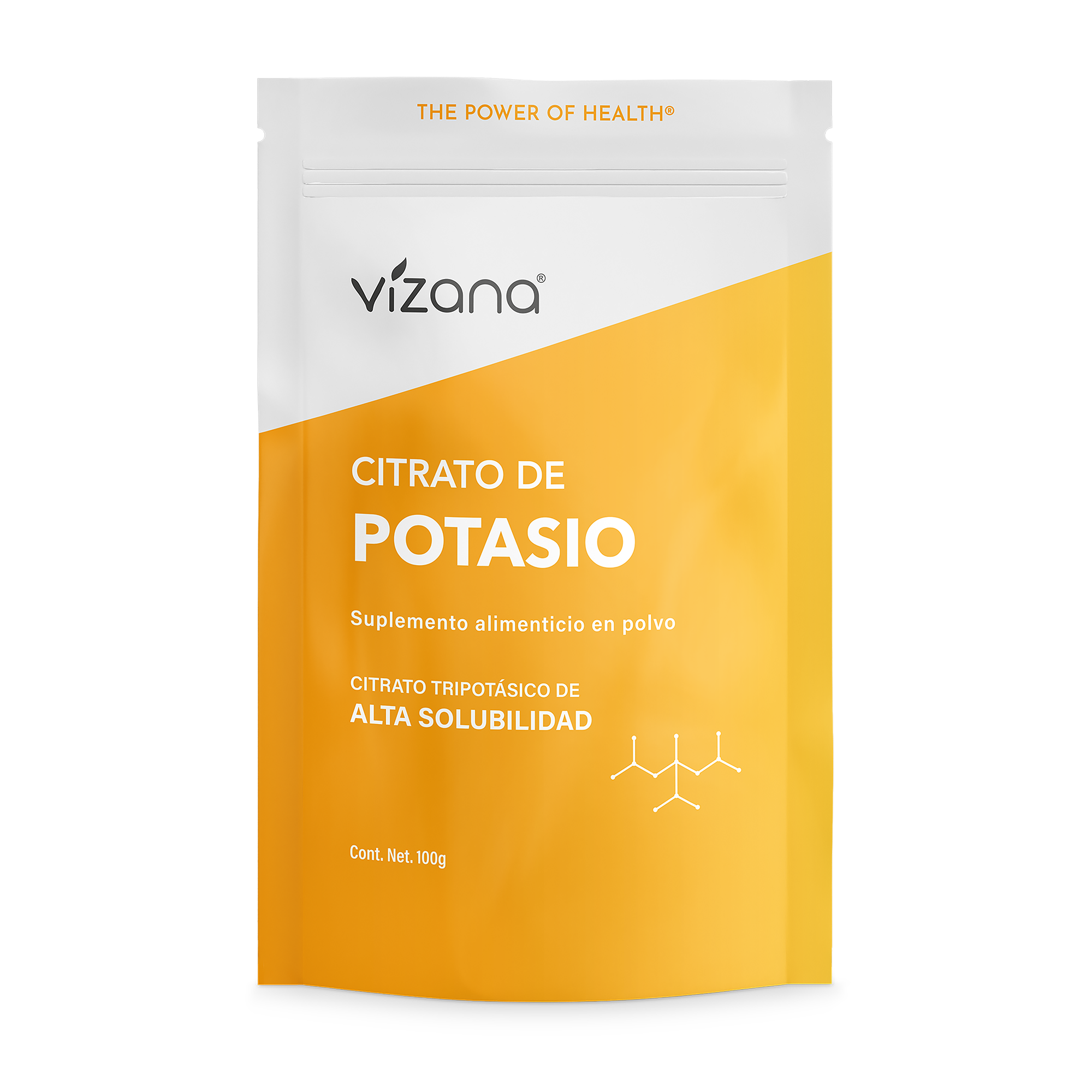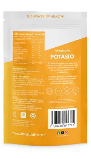 Agregue un cuarto de cucharadita (1.4 g) de Citrato de Potasio en polvo Vizana® a 240 ml de agua purificada, mezcle y consuma de una a dos veces al día, preferentemente con los alimentos. No exceda la porción recomendada.