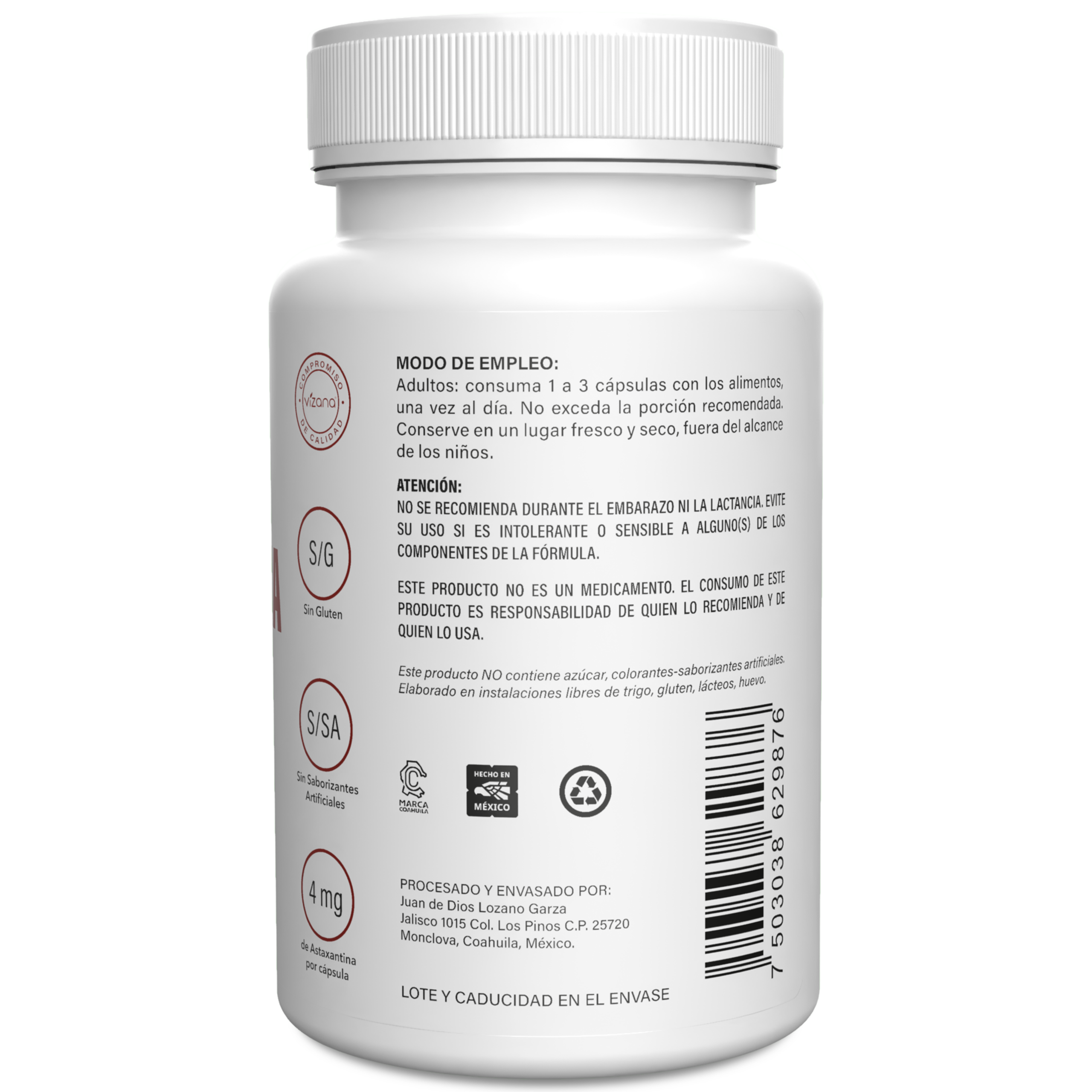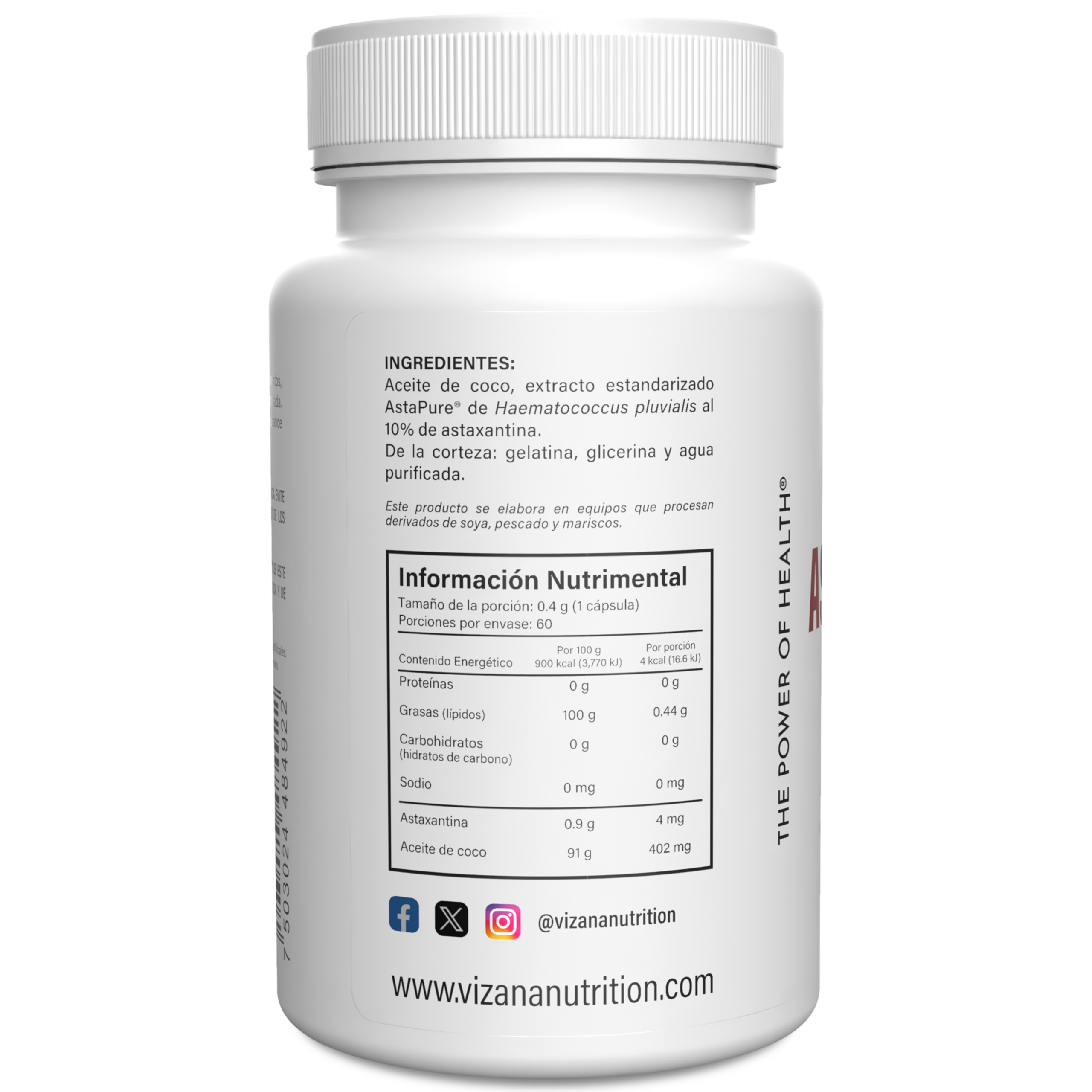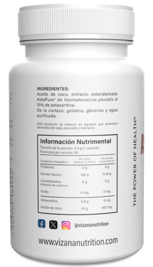 Aceite de coco, extracto estandarizado AstaPure® de Haematococcus pluvialis al 10% de astaxantina. De la corteza: gelatina, glicerina y agua purificada.