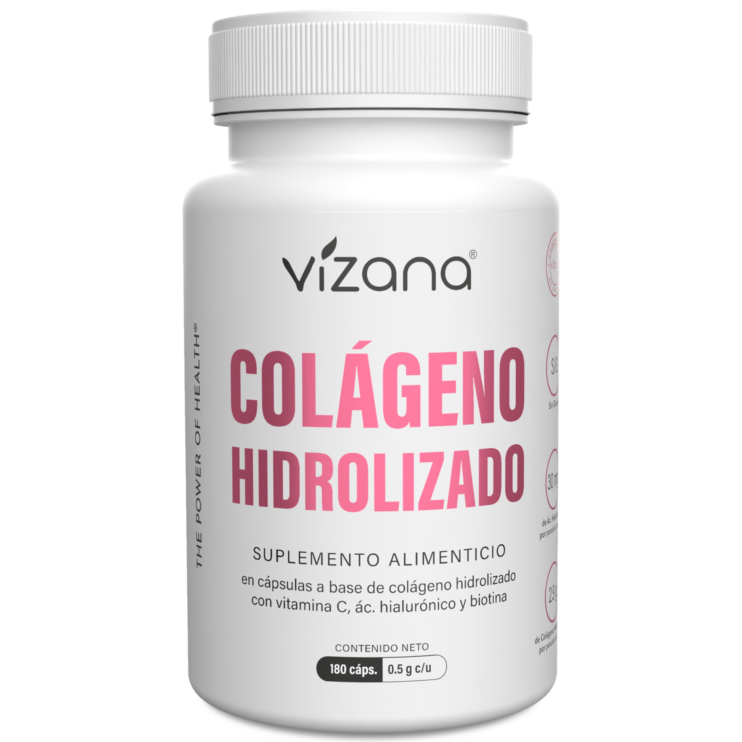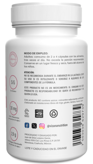 El colágeno es una cadena de triple hélice compuesta por aminoácidos, entre los que destacan glicina, hidroxiprolina/prulina y ácido glutámico. Proveniente de tejido conectivo de origen animal, el colágeno Vizana® es hidrolizado para obtener péptidos de bajo peso molecular que, junto con la vitamina C añadida, facilitan su absorción. Además, es adicionado con vitamina C, biotina y ácido hialurónico.