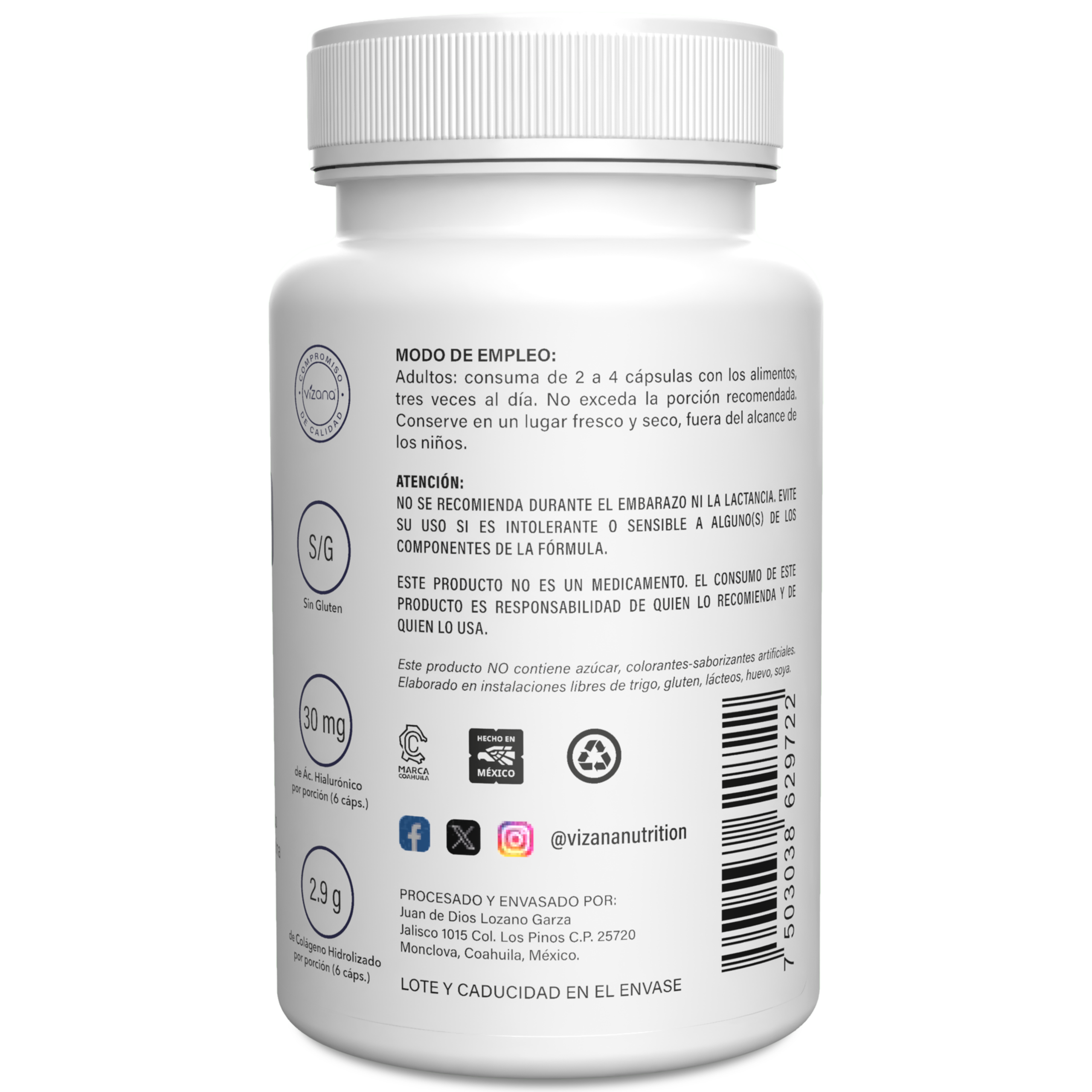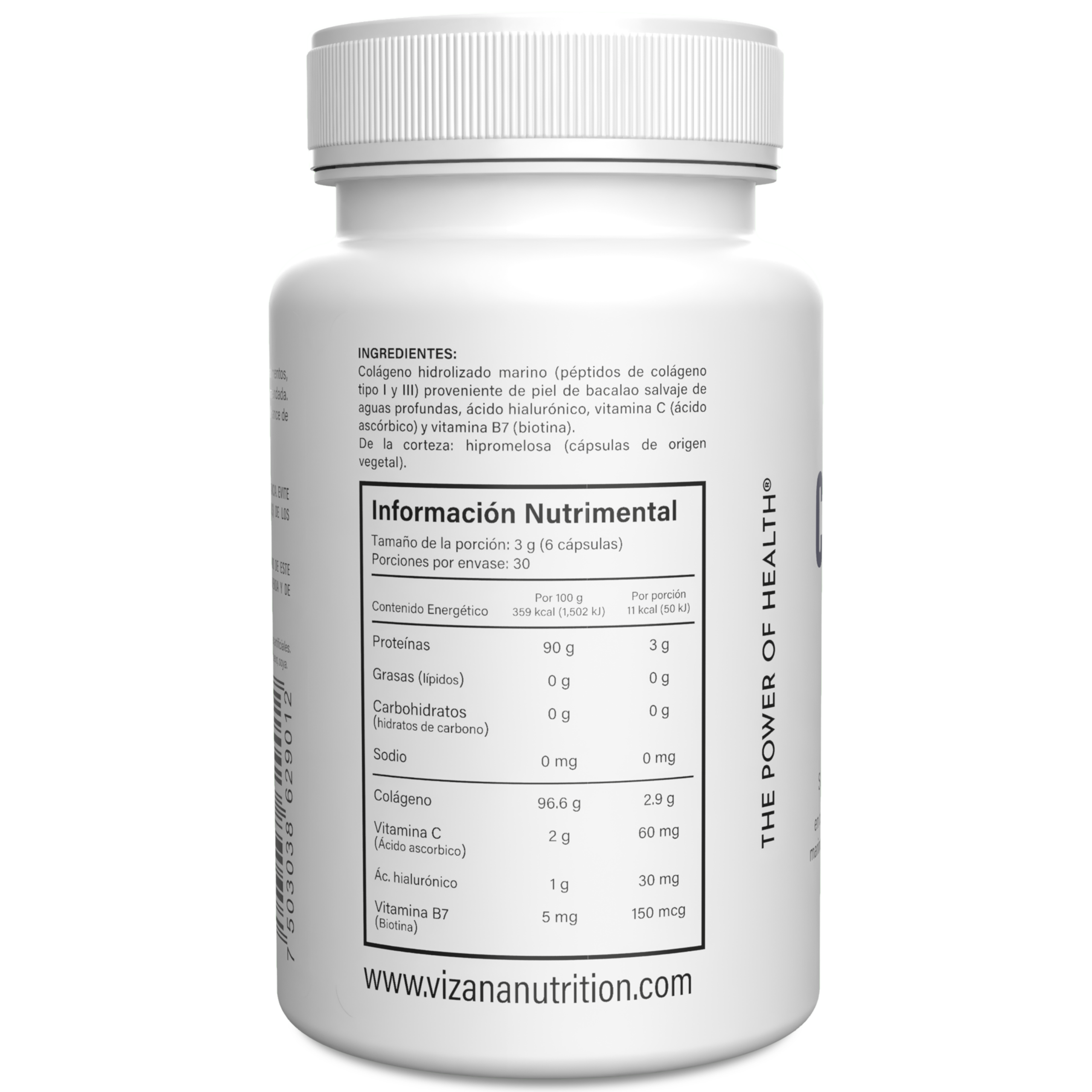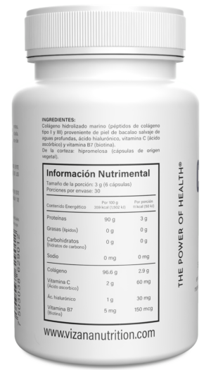 Colágeno hidrolizado marino (péptidos de colágeno tipo I y III) proveniente de piel de bacalao salvaje de aguas profundas, ácido hialurónico, vitamina C (ácido ascórbico) y vitamina B7 (biotina). De la corteza: hipromelosa (cápsulas de origen vegetal).
