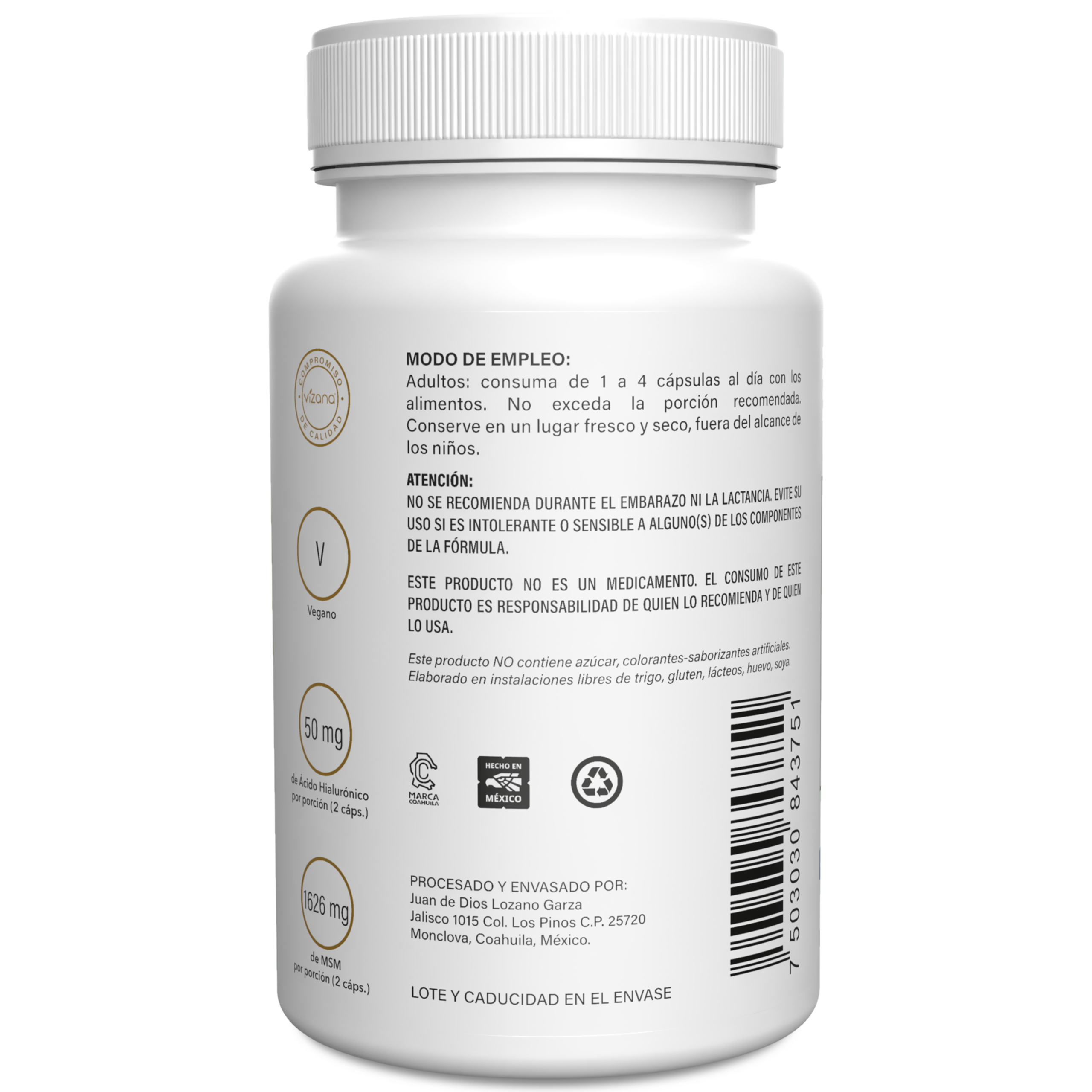 MSM (metilsulfonilmetano) y ácido hialurónico. De la corteza: hipromelosa (cápsulas de origen vegetal).