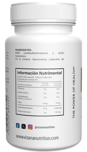 MSM es un compuesto de azufre orgánico formado a partir de lignanos. Las siglas MSM significan “metilsulfonilmetano”, compuesto proveniente de la forma oxidada de dimetilsulfoxido. El azufre es uno de los minerales más abundantes de nuestro cuerpo, el cual se ha caracterizado por sus beneficios en osteoartritis, mejoras en inflamación, digestión, espasmos musculares, cabello y piel.