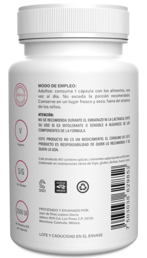 La vitamina D3 de 2500 UI es un nutriente esencial que apoya el sistema inmunológico, la salud ósea y el correcto funcionamiento muscular. Contribuye a la absorción adecuada del calcio y el fósforo, favoreciendo huesos fuertes y un equilibrio mineral óptimo. Además, participa en funciones clave del estado de ánimo y el bienestar general.